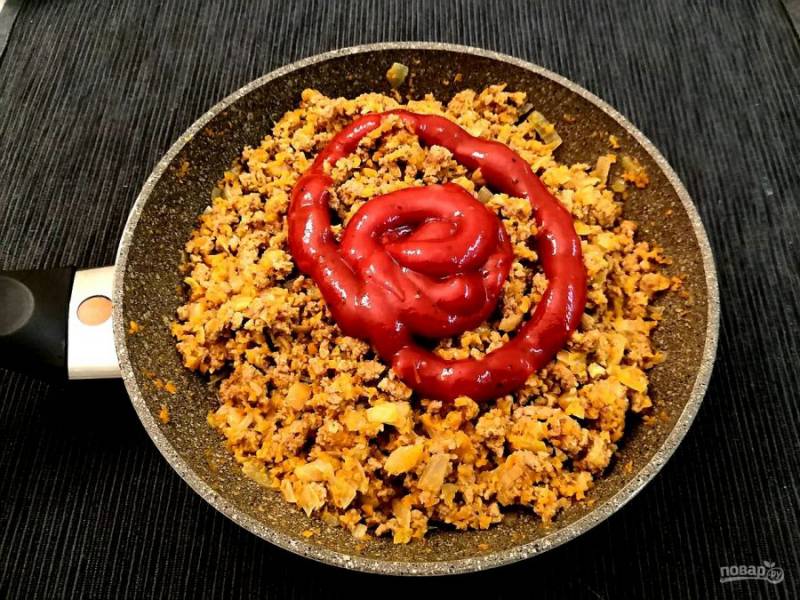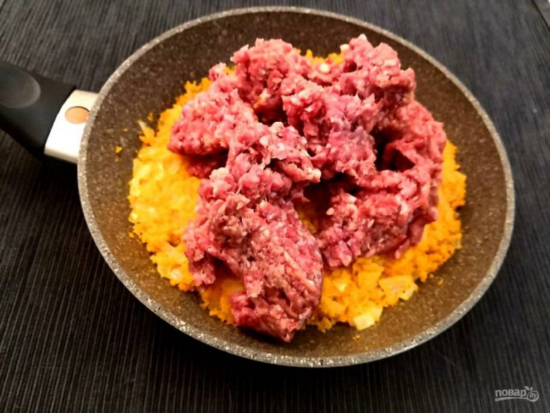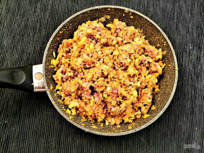 Добавить фарш. Можно взять готовый или приготовить самим.