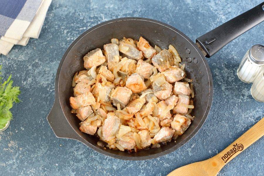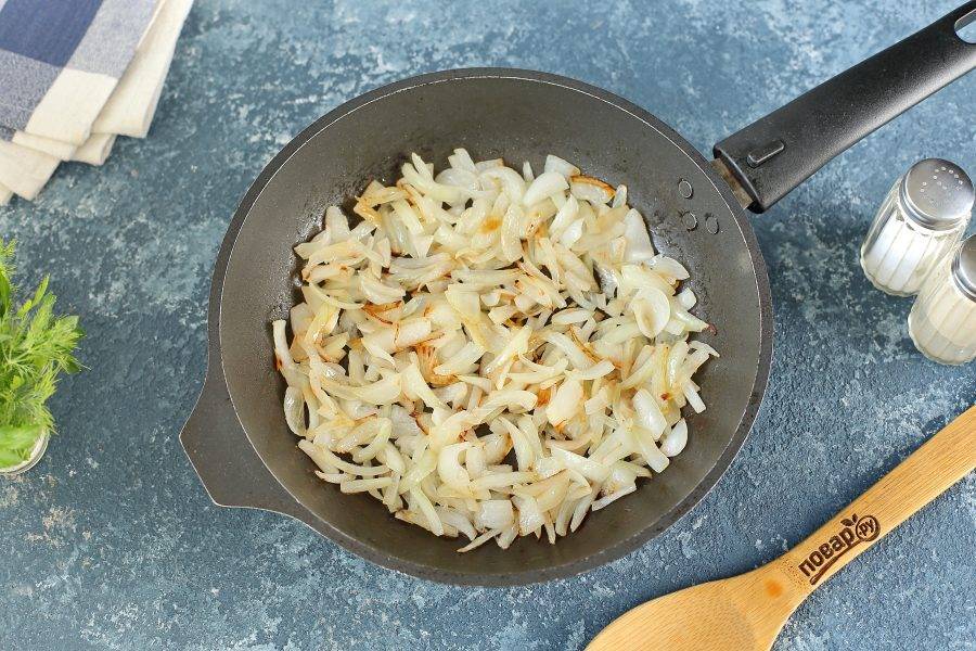 Лук нарежьте кубиками и обжарьте в сковороде до мягкости.