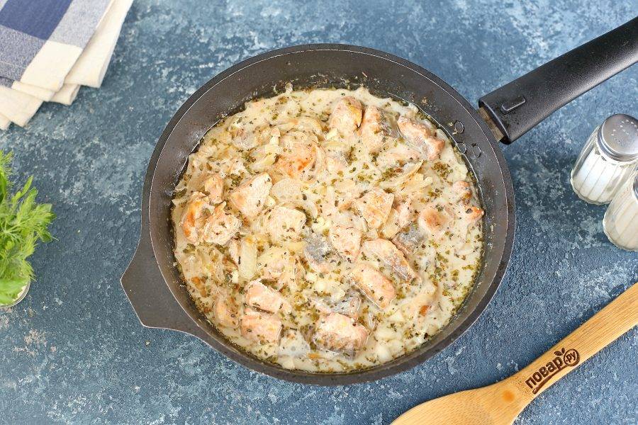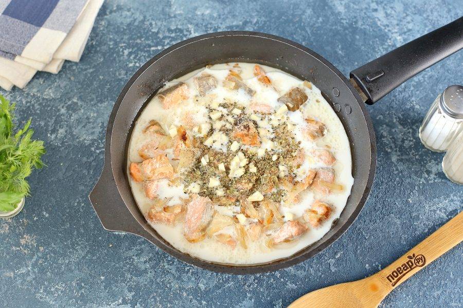 Затем влейте сливки, добавьте измельченный чеснок, специи и соль по вкусу.