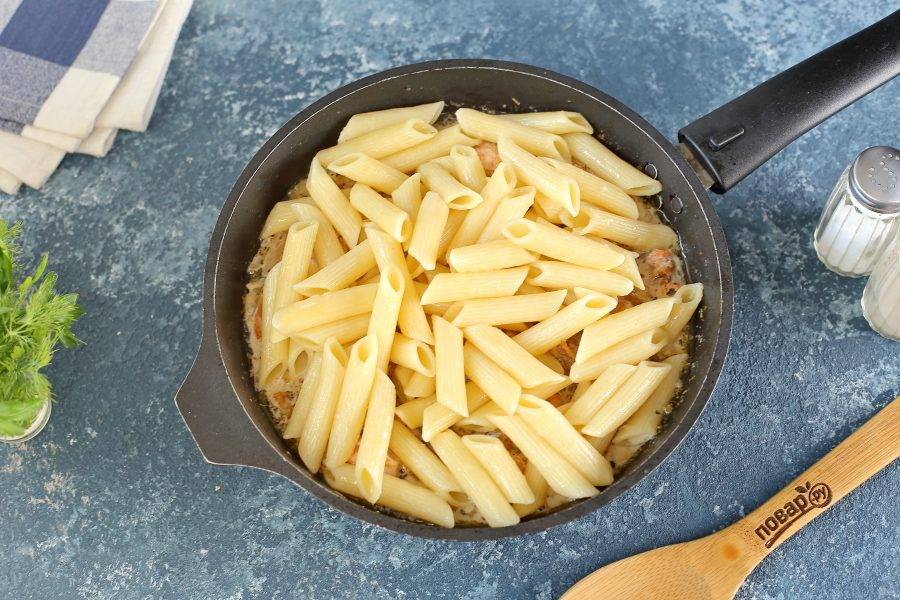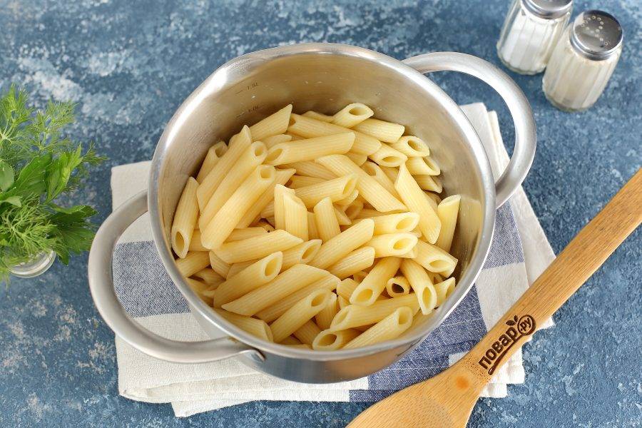 В кипящей подсоленной воде отварите пасту до состояния «аль денте». Точное время приготовления пасты уточняйте на упаковке и отнимайте от него 2 минуты. Макароны можно взять любые, главное, чтобы они были из твердых сортов и в процессе не разбухли.