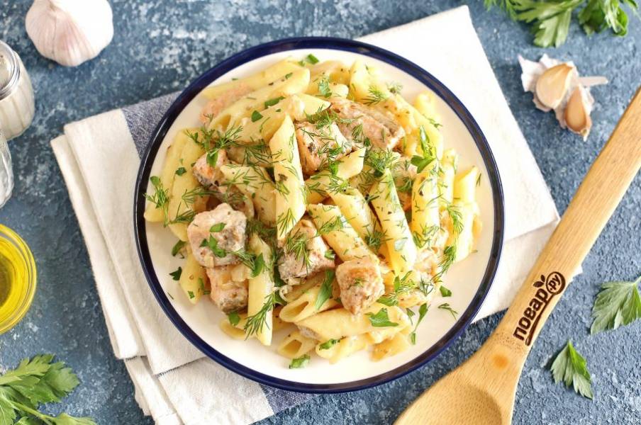Очень вкусное, ароматное и сытное блюдо итальянской кухни. Макароны с лососем или любой другой красной рыбой, тушатся в сливках с добавлением ароматных специй. Готовится блюдо буквально за 20 минут.
