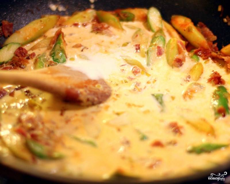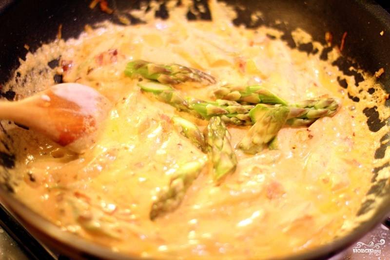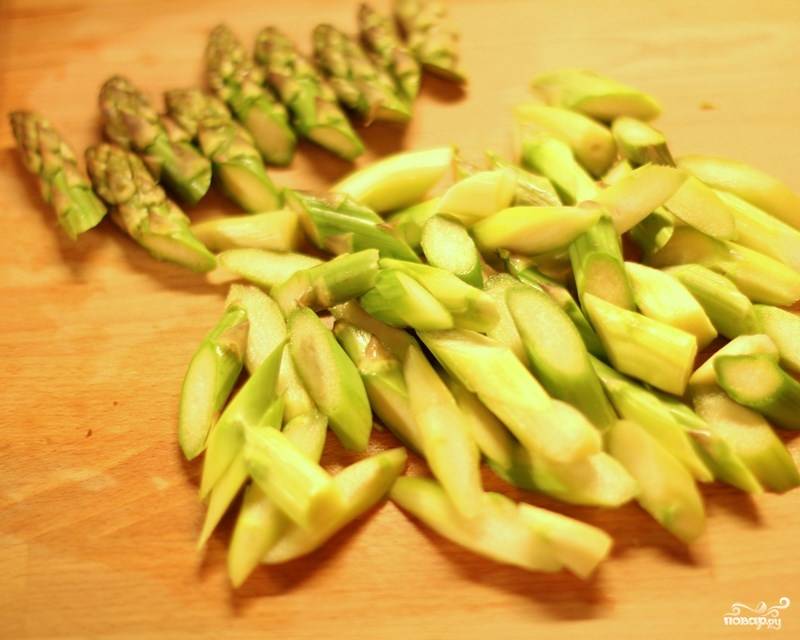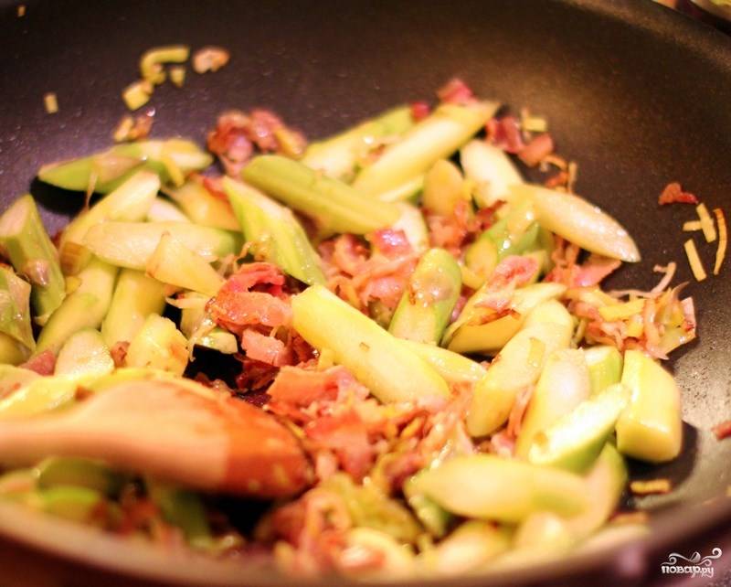 Пока паста варится, лук и бекон нарезаем мелкими кубиками. Спаржу промываем, нижнюю часть побега чистим и нарезаем наискосок небольшими кусочками по 2 см.