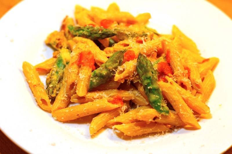 В сковородку закидываем отваренную пасту. Если нужно солим и перчим. Греем на медленном огне около 2 минут. При подаче пасту со спаржей посыпаем рубленой петрушкой и натертым пармезаном. Приятного аппетита!