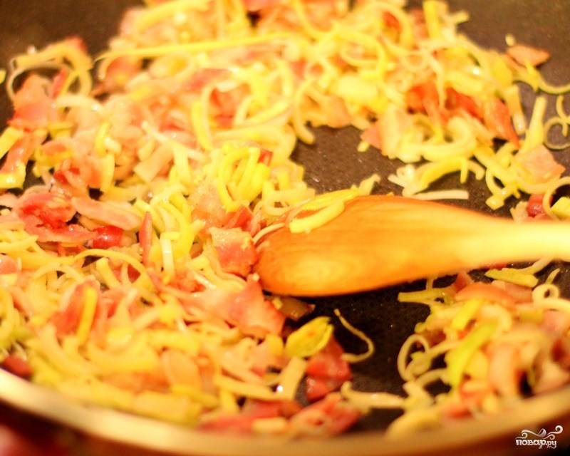 В глубокой толстостенной сковородке разогреваем оливковое масло и обжариваем в нем лук и бекон.