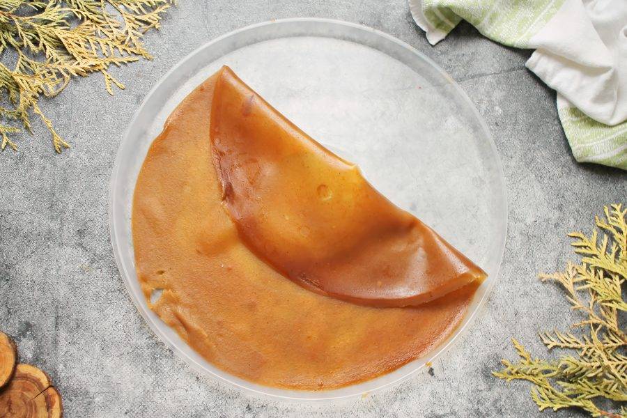Установите поддон в сушилку и готовьте пастилу в течение 8-10 часов при температуре 60-70 градусов. Она должна высохнуть, но остаться эластичной.