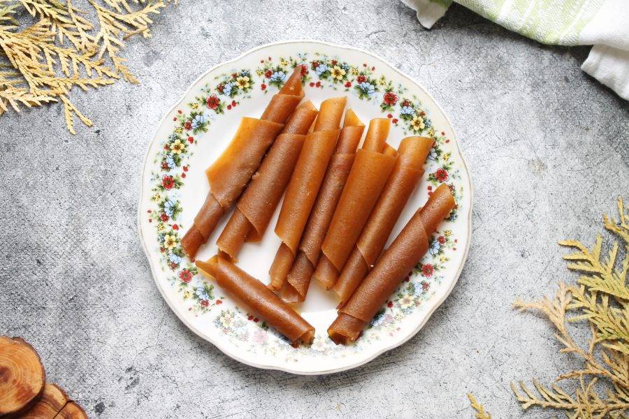 Снимите готовую пастилу с поддона, разрежьте на сегменты и сверните рулетиками.