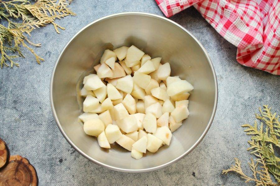 Груши почистите от кожуры и сердцевины, порежьте на кусочки и выложите в миску.