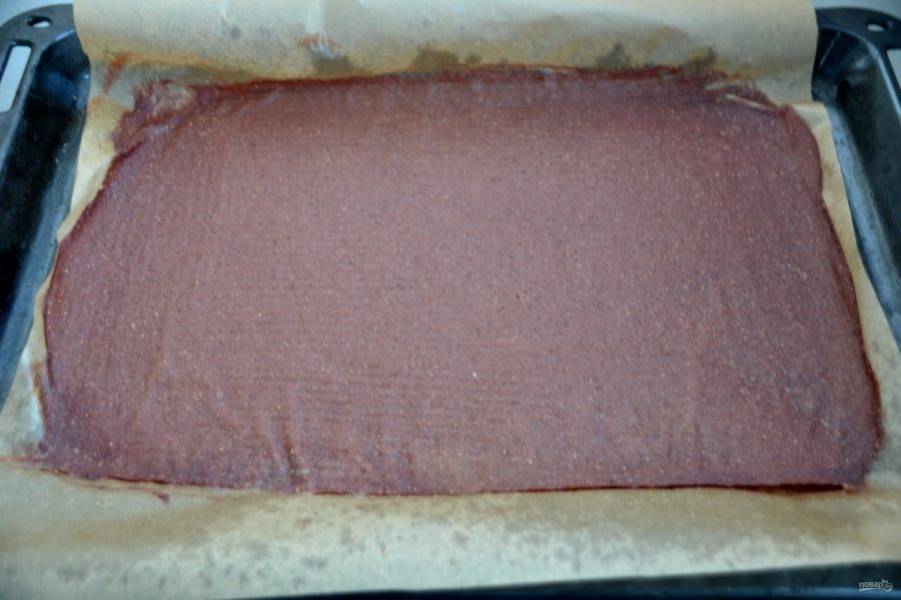 Разделите инжирную массу на два противня, разровняйте. Сушите в духовке в режиме "верх-низ, плюс конвекция" при температуре 75 градусов в течение часа.