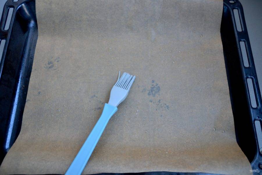 Подготовьте противень, застелите его пергаментом. Если не уверены в своем пергаменте, смажьте его слегка растительным маслом без запаха.