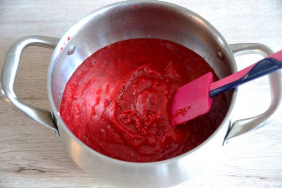 Всыпьте в ягодное пюре сахар, размешайте до растворения.