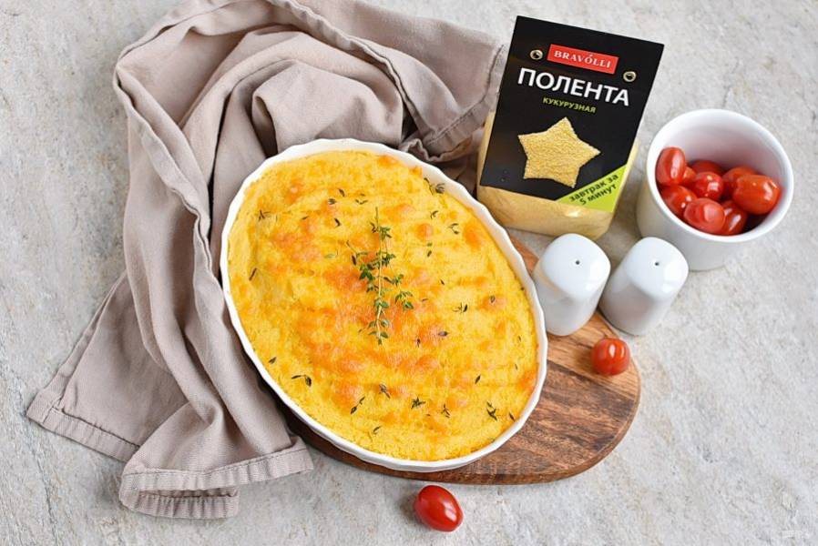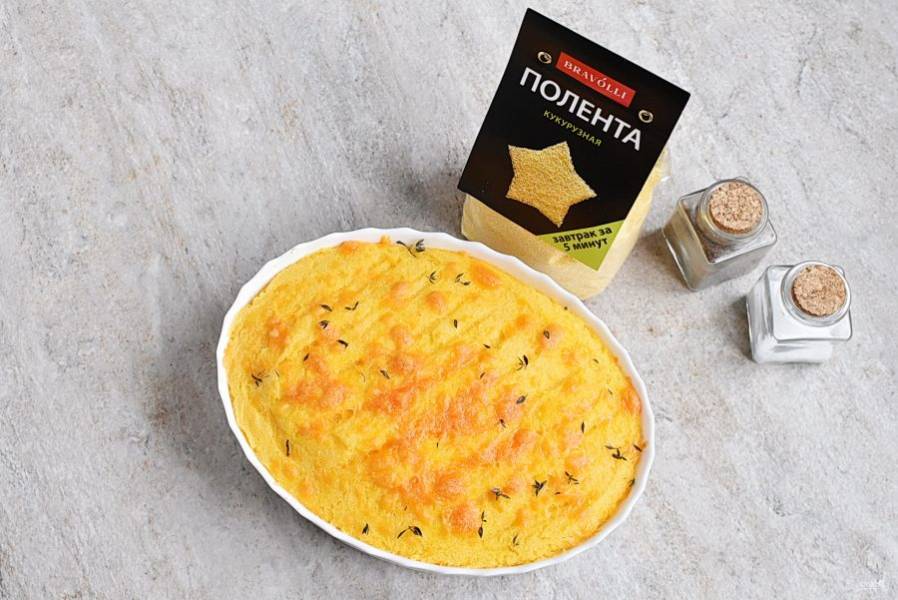 Сверху ровным слоем выложите поленту «Bravolli», разровняйте верх и посыпьте остатками тертого сыра.
