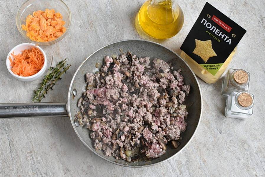 Добавьте фарш и жарьте, помешивая и разбивая комочки, до рассыпчатости фарша.