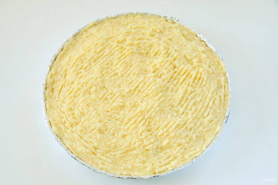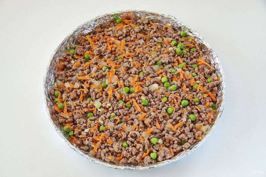 10. Форму для запекания застелите фольгой и выложите ровным слоем мясной фарш.