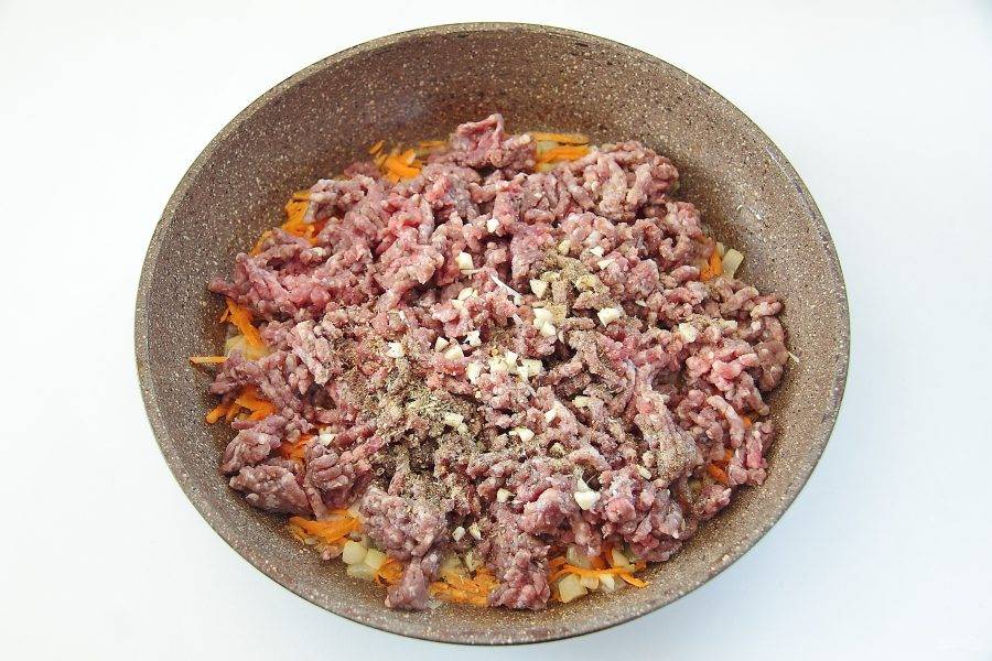 7. Добавьте мясной фарш, измельченный ножом чеснок, соль и специи по вкусу.