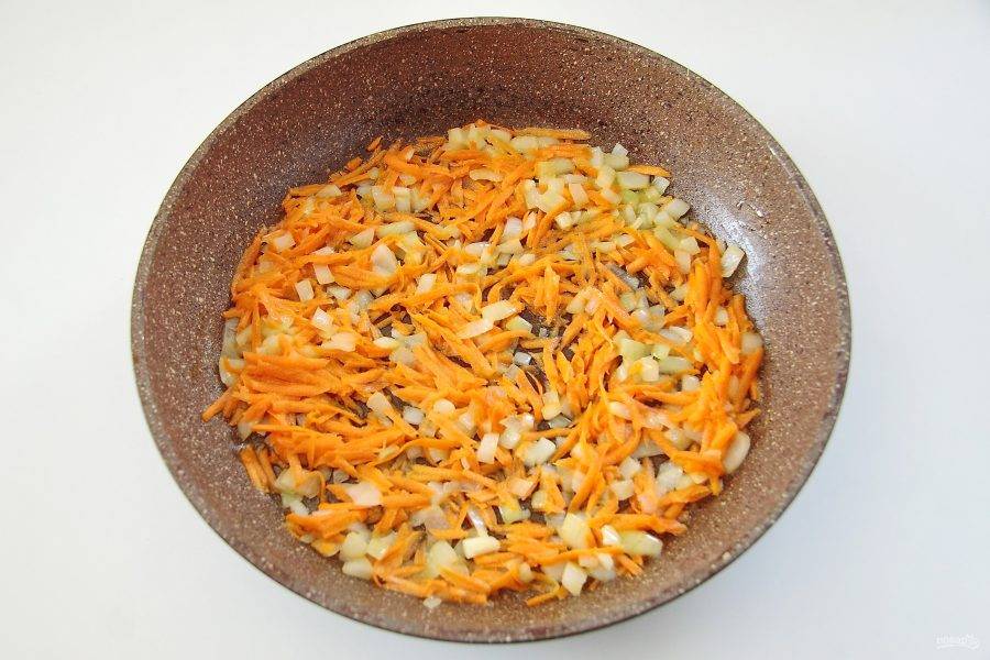 6. На сковороде растопите оставшееся сливочное масло и обжарьте до мягкости нарезанный кубиками лук и тертую морковь.