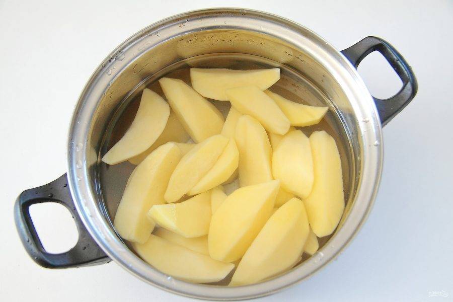 2. Картофель очистите, нарежьте и сложите в кастрюлю с водой.
