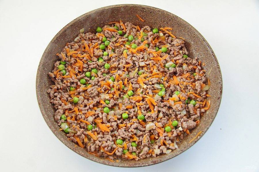 8. Обжаривайте все вместе периодически помешивая около 5 минут. Добавьте горошек.