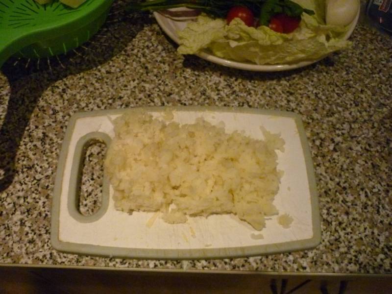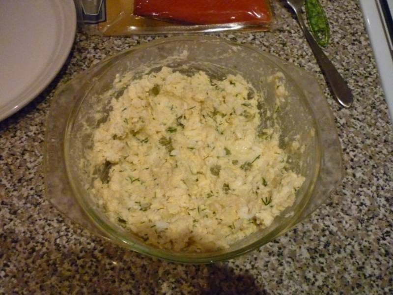 Смешиваем: картофель, сыр, яица, лук, порезанные мелкими дольками корнишоны и заливаем нашим соусом, перемешиваем до образования клейкой массы.