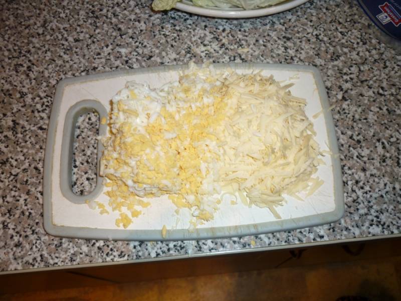 Сыр и 2 яйца трем на крупной терке, 1 яйцо оставляем для украшения.