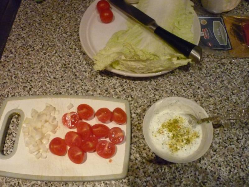 Половину луковицы шинкуем мелким кубиком, помидоры-чери режем пополам. Делаем соус: майонез и сметану смешиваем 1к1, добавляем мелко рубленую зелень петрушки, выжимаем половину лимона, горчицу по вкусу.