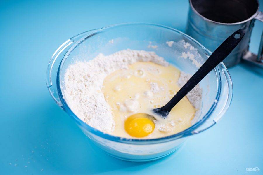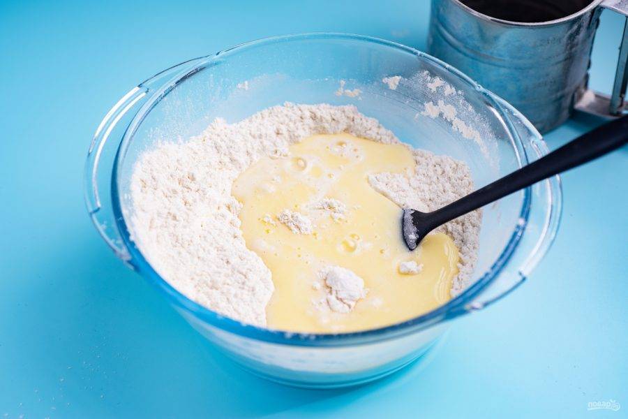 Залейте теплое молоко, предварительно растопленное сливочное масло.