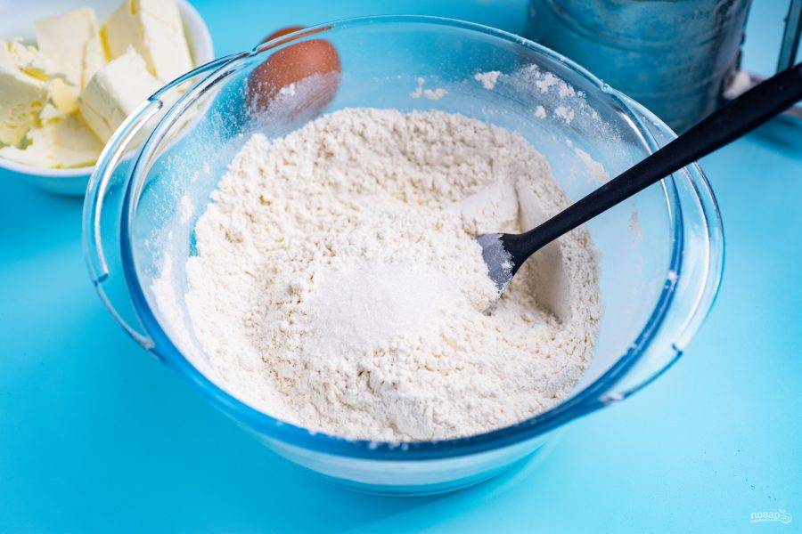 В просторную миску просейте всю муку и добавьте быстродействующие дрожжи. Перемешайте.