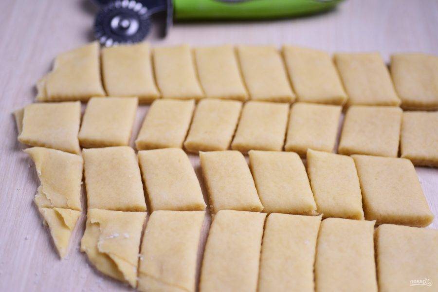 Теперь сложенное тесто нарежьте на небольшие прямоугольники — это заготовки будущего печенья.