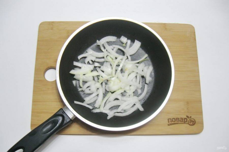 Репчатый лук очистите, помойте и нарежьте полукольцами. Выложите в сковороду.