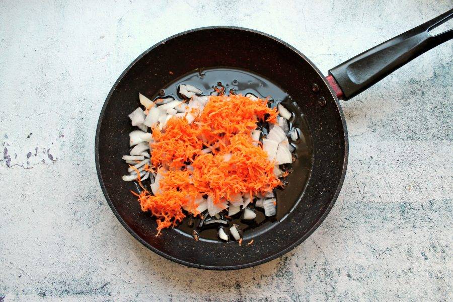 Морковь натрите на крупной терке и добавьте к луку. Обжаривайте все на среднем огне в течение 7 минут, перемешивая.