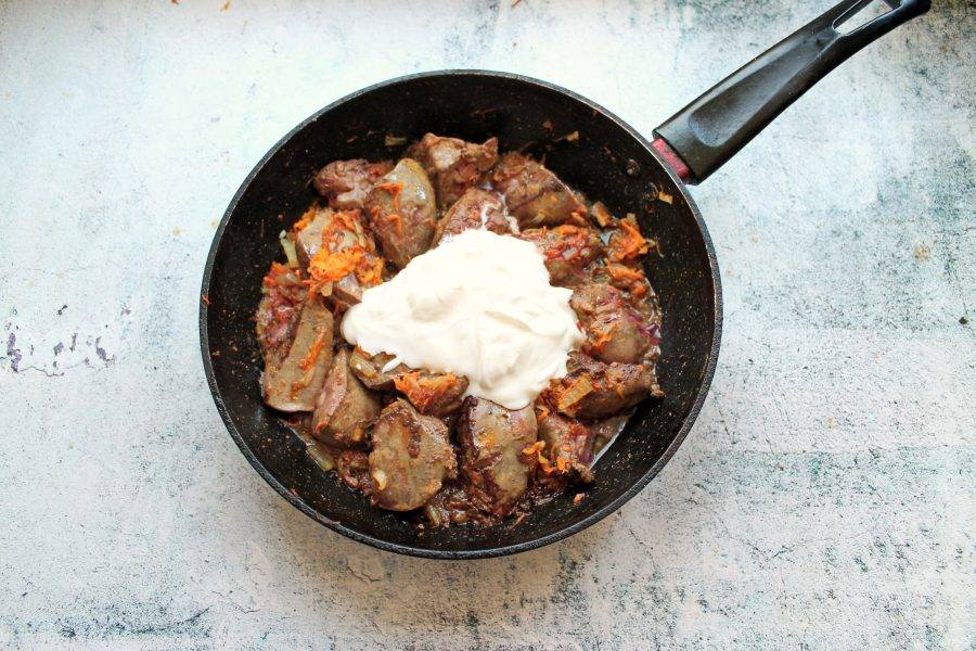 Добавьте в сковороду сметану, посолите, поперчите и перемешайте.