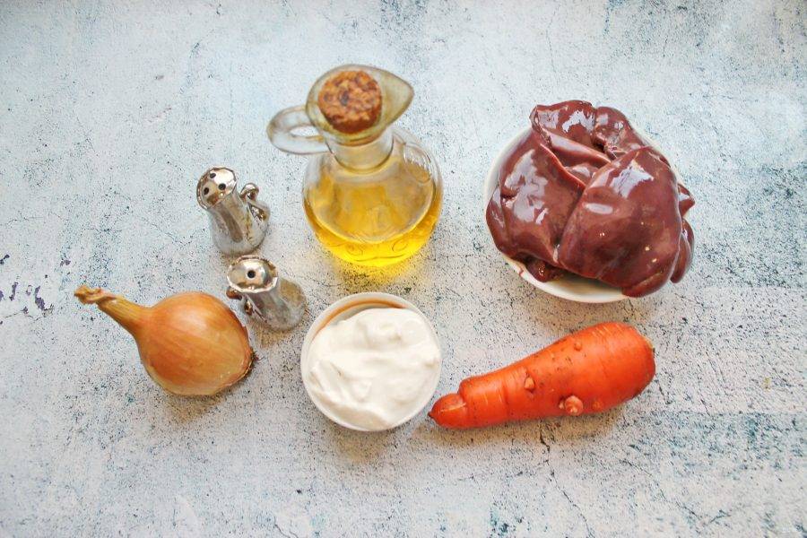 Подготовьте все необходимые ингредиенты для приготовления печени индейки с морковью и луком в сметане. Печень сполосните и разрежьте на части. Если попалась печень с желчным пузырем, удалите его.