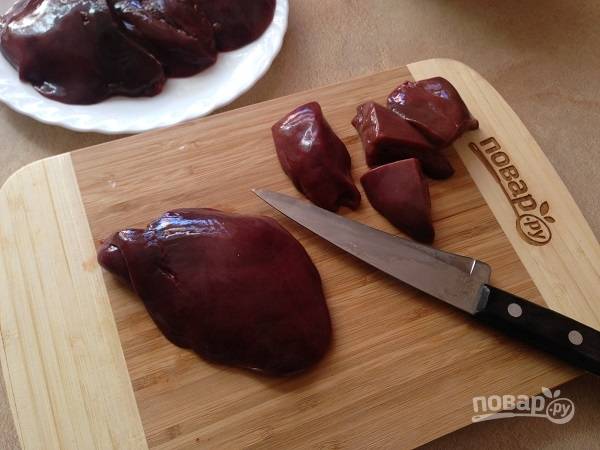3. Печень индейки тщательно очистим от пленок и помоем. Обсушим и нарежем на более мелкие кусочки.