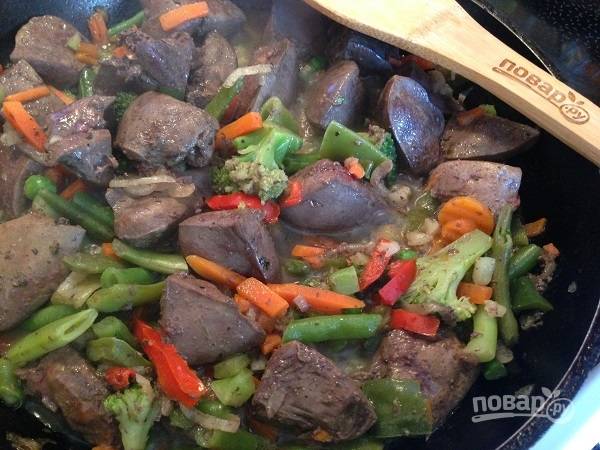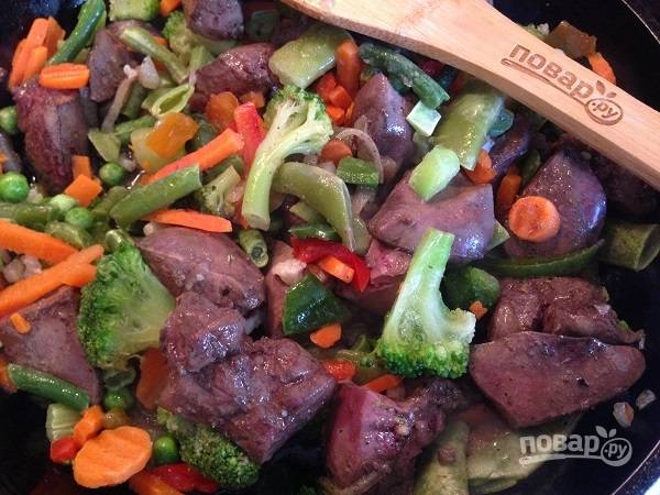 6. Добавляем к печени овощи, перемешиваем. Солим, перчим и посыпаем сушеным базиликом или другими вашими любимыми приправами.