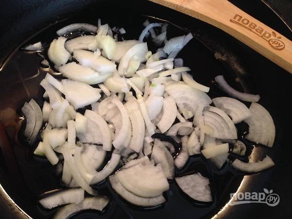 2. Луковицу очистим, нарежем четвертькольцами и выложим на разогретую с растительным маслом сковороду. Обжариваем лук до прозрачности или легкого подрумянивания.
