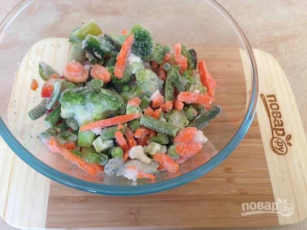 1. Для приготовления блюда я использую смесь замороженных овощей: морковь, зеленый горошек, брокколи, стручковая фасоль и болгарский перец.