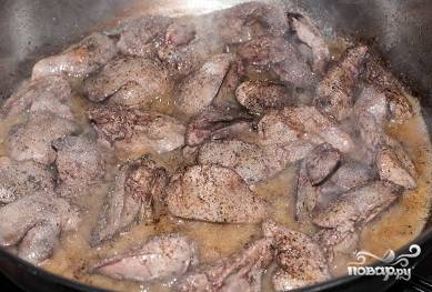Обжаривайте печень на курином жиру до тех пор, пока кровь перестанет выделяться.