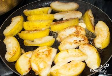 Нарезанные дольками яблоки обжарьте в отдельной сковороде до красивой золотистой корочки.
