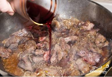 К печени с луком добавьте красное вино, тушите на среднем огне 7 минут, пока алкоголь не испарится.