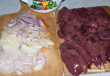 Промойте печень, нарежьте её на небольшие кусочки. Лук очистите и нарежьте полукольцами.