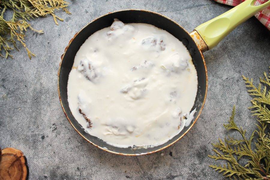 Сметану посолите, поперчите и залейте ей куриную печень сверху.