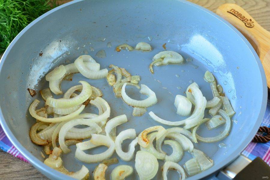 Обжарьте лук на растительном масле до золотистого оттенка.