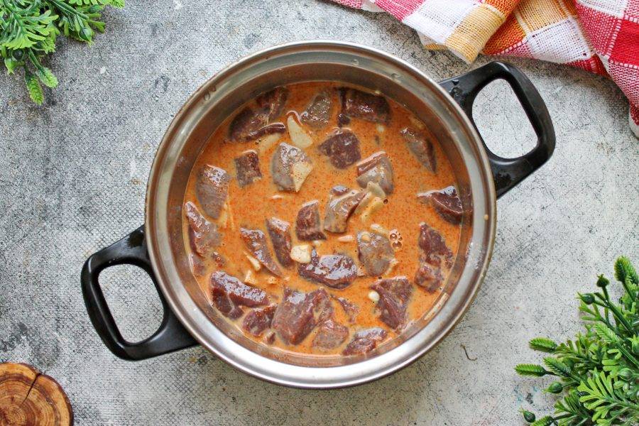 Выложите в сковороду печень вместе с маринадом и готовьте в течение 3 минут перемешивая.
