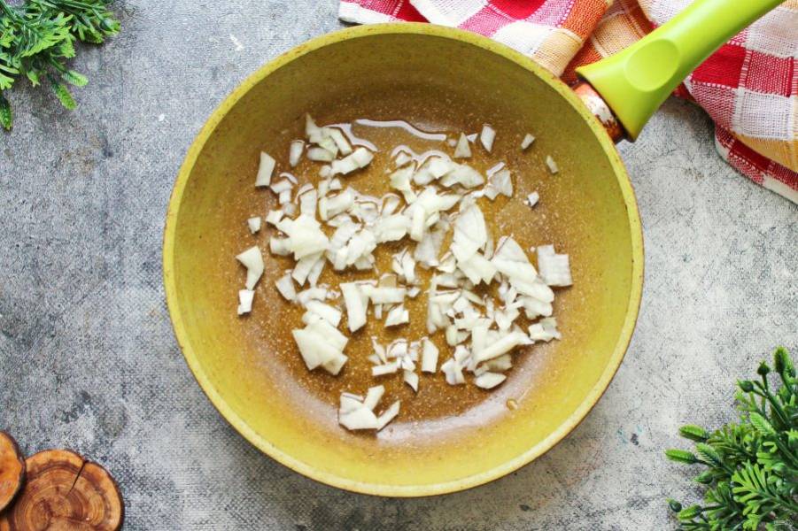 Репчатый лук мелко порежьте. В сковороду налейте растительное масло, разогрейте на среднем огне и добавьте лук. Обжаривайте его в течение 5-6 минут до мягкости.