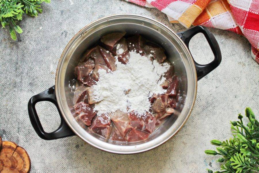 Добавьте к печени крахмал и перемешайте до равномерного распределения.
