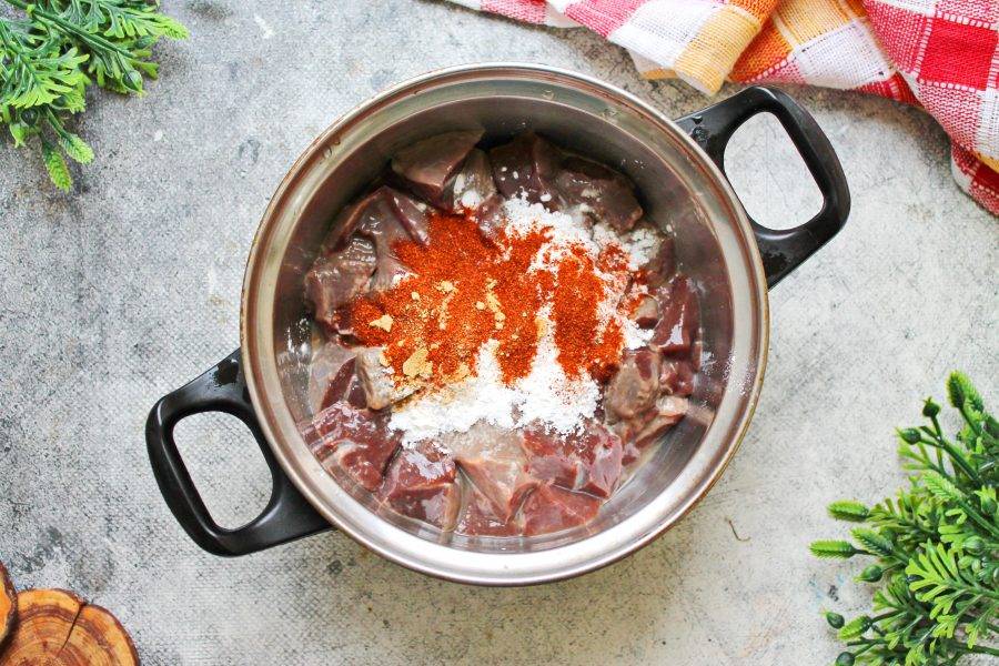 Зачистите печень от пленок и жил, порежьте на куски и замочите их на 20 минут в холодной воде.
