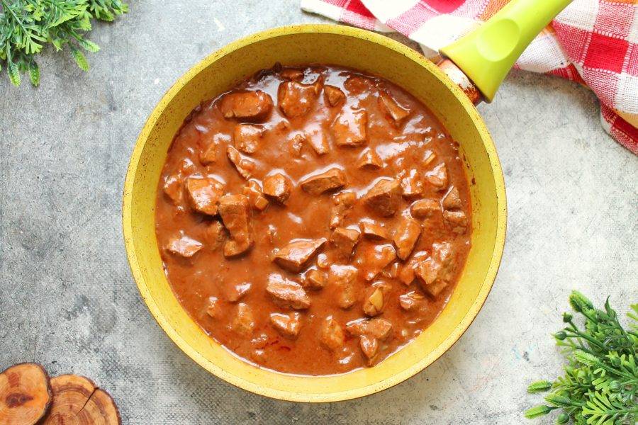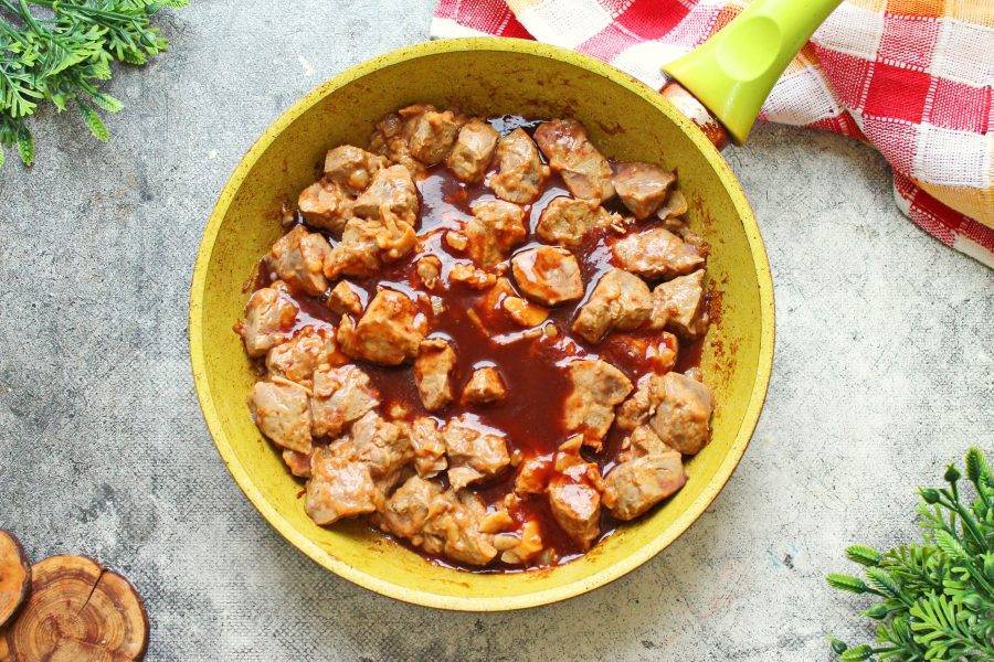 Влейте в сковороду с печенью смесь из соевого соуса, томата, меда, перемешайте. Тушите печень на медленном огне еще 5-6 минут на медленном огне, перемешивая.