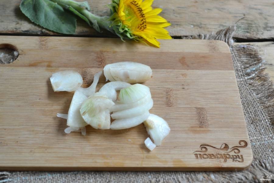 Подготовьте все необходимые ингредиенты. Печень зачистите от пленок и желчных путей, можете предварительно вымочить её в воде или в молоке. Лук очистите от шелухи и хорошо помойте.