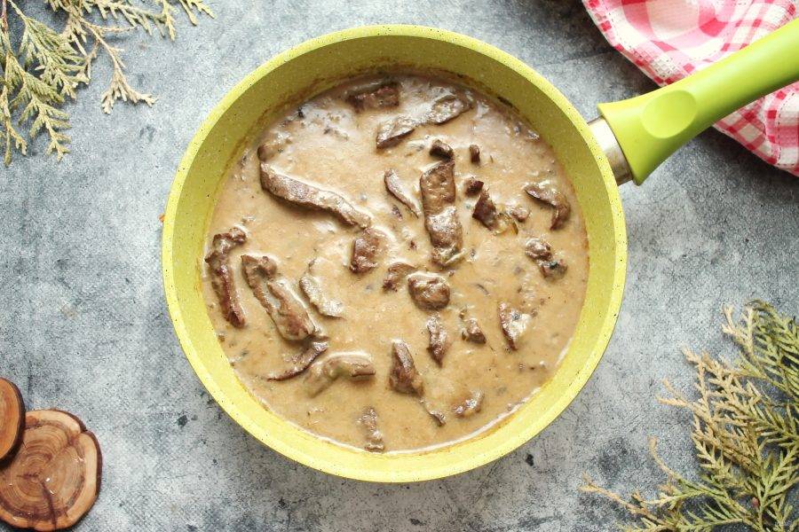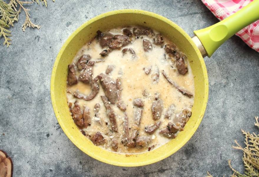 Смешайте сметану, воду и муку до однородности. Влейте сметанную массу к печени с овощами.