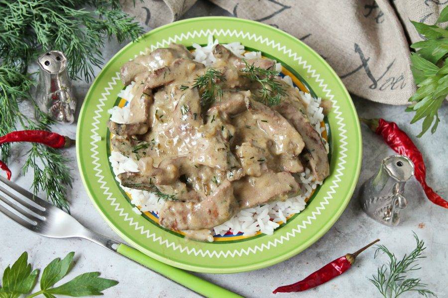 Все посолите, поперчите и тушите под крышкой в течение 10 минут на медленном огне. В другой сковороде разогрейте сливочное масло, добавьте отварной рис и прогрейте на медленном огне под крышкой. Рис разложите по тарелкам, выложите печень с подливой и сразу подавайте блюдо к столу.
