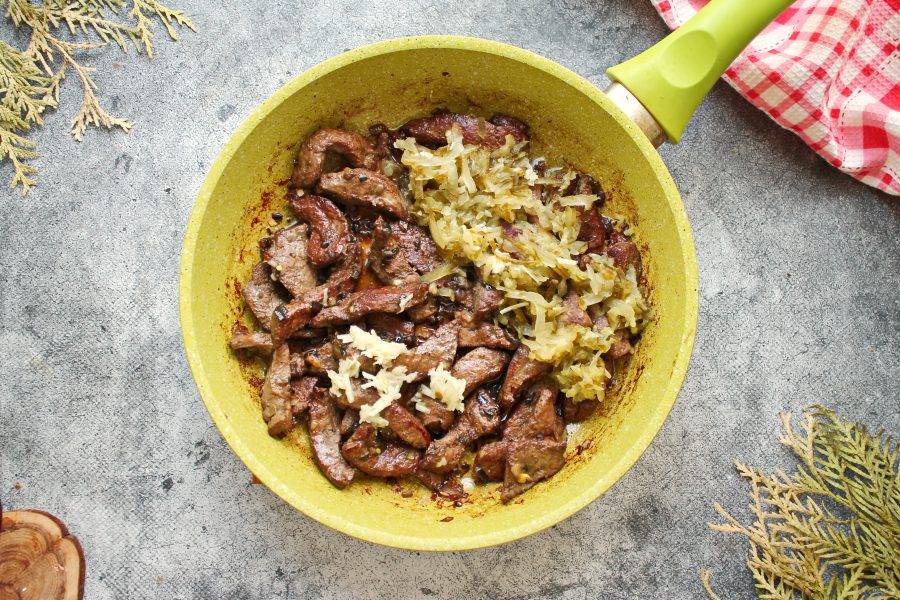 Чеснок измельчите, соленые огурцы порежьте тонкой соломкой или натрите на крупной терке, добавьте в сковороду. Все хорошо перемешайте.
